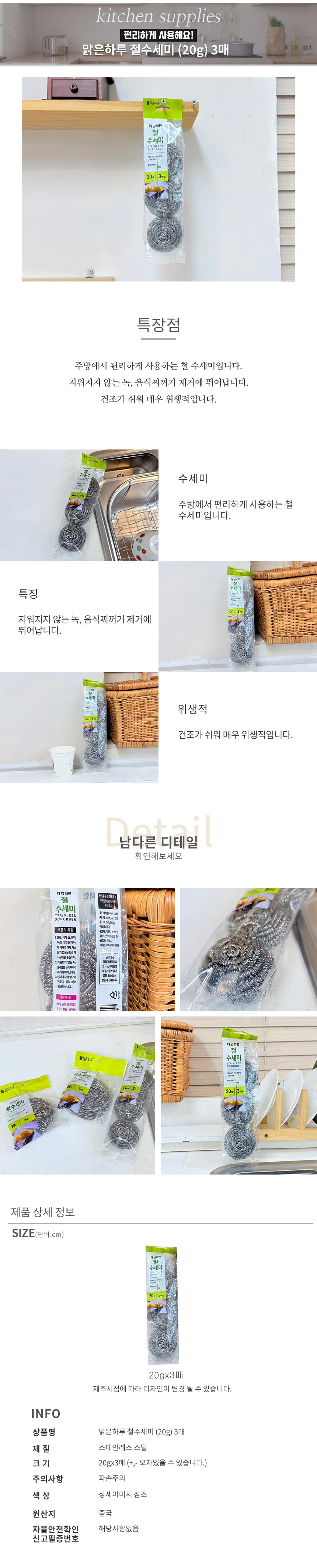 | 고시분류코드 및 분류명 | 17 주방용품 | 품명 및 모델명 | 맑은하루 철수세미 (20g) 3매 |